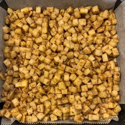 - Prepare the apple layer by mixing together the cubed apples, lemon juice, brown sugar, flour, and chai spices. Even spread the apples over the crust layer.