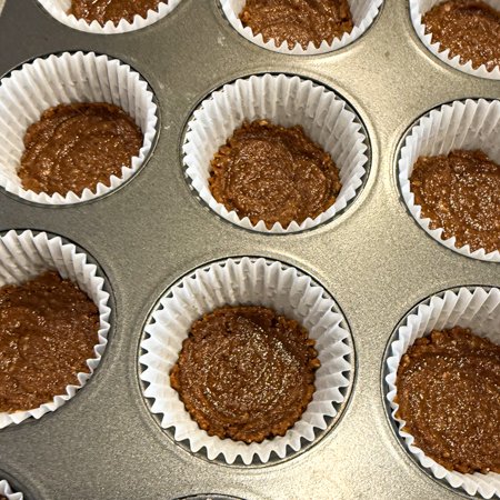 - Divide the crust mixture evenly into the cupcake pan. Using a spoon or the bottom of a shot glass, press down the crumbs so that they are tightly packed in an even layer and cover the bottom of each cupcake liner.