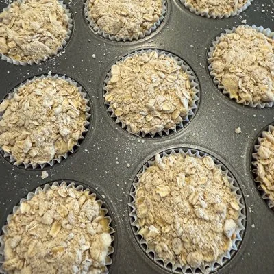 - Sprinkle a generous amount of the oat crumble topping on each muffin.