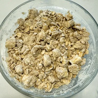 First, make the cinnamon oat crumble topping. Stir together flour, oats, brown sugar, and cinnamon in a medium bowl. Add cold, cubed butter and mix with your hands, forks, or pastry cutter breaking up the butter as you go until you have pea-sized clumps like in the image below. Cover and refrigerate the crumble until you are ready to use it later.
