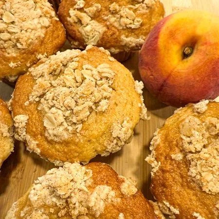 Peach puree mixed into vanilla muffins with a cinnamon oat crumble topping.